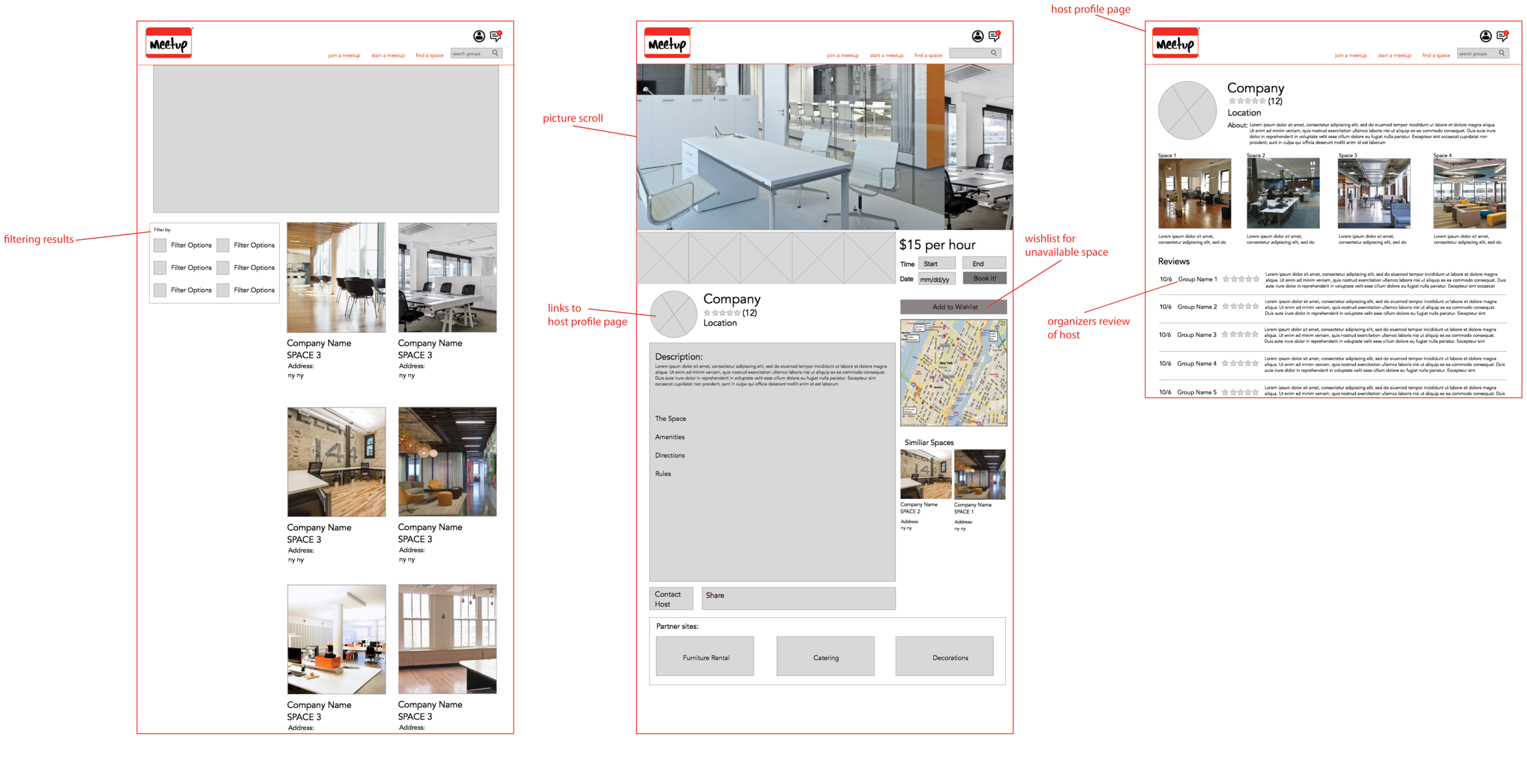 While Meetup is incredibly effective for bringing people with similar interests together, it does not provide its user with resources for finding space rental to meet the specific needs of a meetup event. Users still have to painstakingly research different venues using outside resources. This presented an unique opportunity for our team; Allison Davies, Andy Lai and I. A new feature allowing existing users ways to communicate with potential space host and rent from potential space host, saving time and building on the sense of community that Meetup strives for. The two Meetup users group affected would be the organizers(the ones looking for space) and the host.